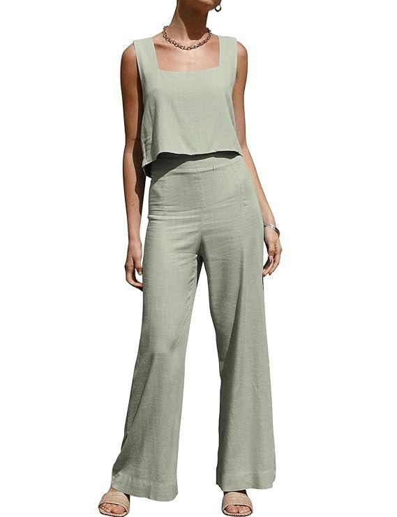 Women's Summer 2 Piece Outfits Sleeveless Square Neck Tops Wide Leg Pants set Jumpsuit with Pockets