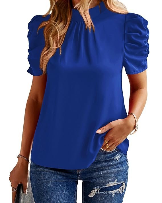 Women's Summer Boho Shirt Top Ruffle Short Sleeve Frill Trim Mock Neck Floral Solid 2023 Casual Blouses Shirts Tops