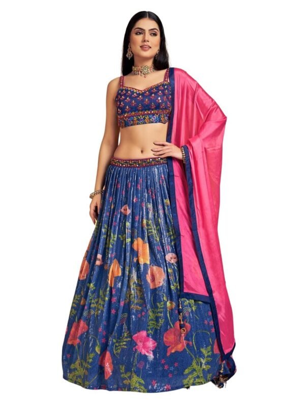 Women's Navy Blue Sequins Lehenga with Handwork Blouse and Printed Lehenga
