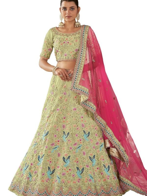 Women's Pista Green Color Art Silk Fabric bird motif design Lehenga For Women