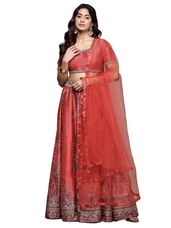 Women's Red Tuberose Square Neck Blouse With Lehanga And Dupatta